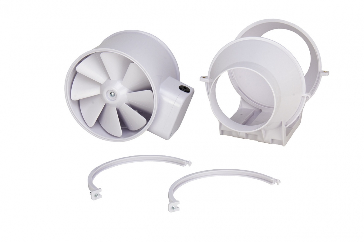 Вентилятор состоит из двух частей: монтажного кронштейна и закрепленного на нем корпуса вентилятора. Все корпусные элементы: корпус, патрубки, кронштейны и хомуты изготовлены из АБС пластика, имеют повышенный класс брызгозащиты и обладают диэлектрическими свойствами. Оборудован внешней клеммной коробкой с возможностью переключения скоростей.